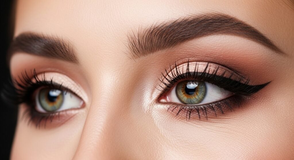The eye makeup appeared to be clear and natural. Soft shadows and blended shadows can have added depth and at the same time seem delicate. This style perhaps fit the serene grace that the hairstyle implied.