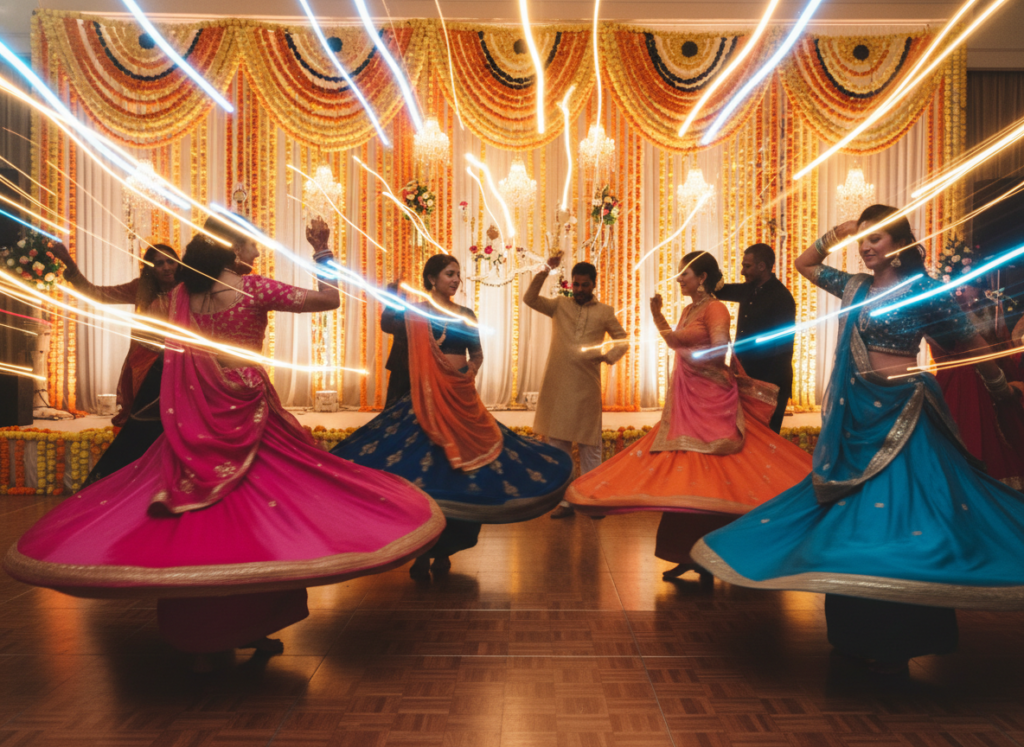 Halls lights flash where crowds sway steps lehenga twirls dupatta fly. Still, djs queue tracks crowds roar hooks drop. Also, phones film clips share nights long. Then mornings sore feet smiles wide hold. Ownership nights reels family own. Daily memories dances hearts beat fast.